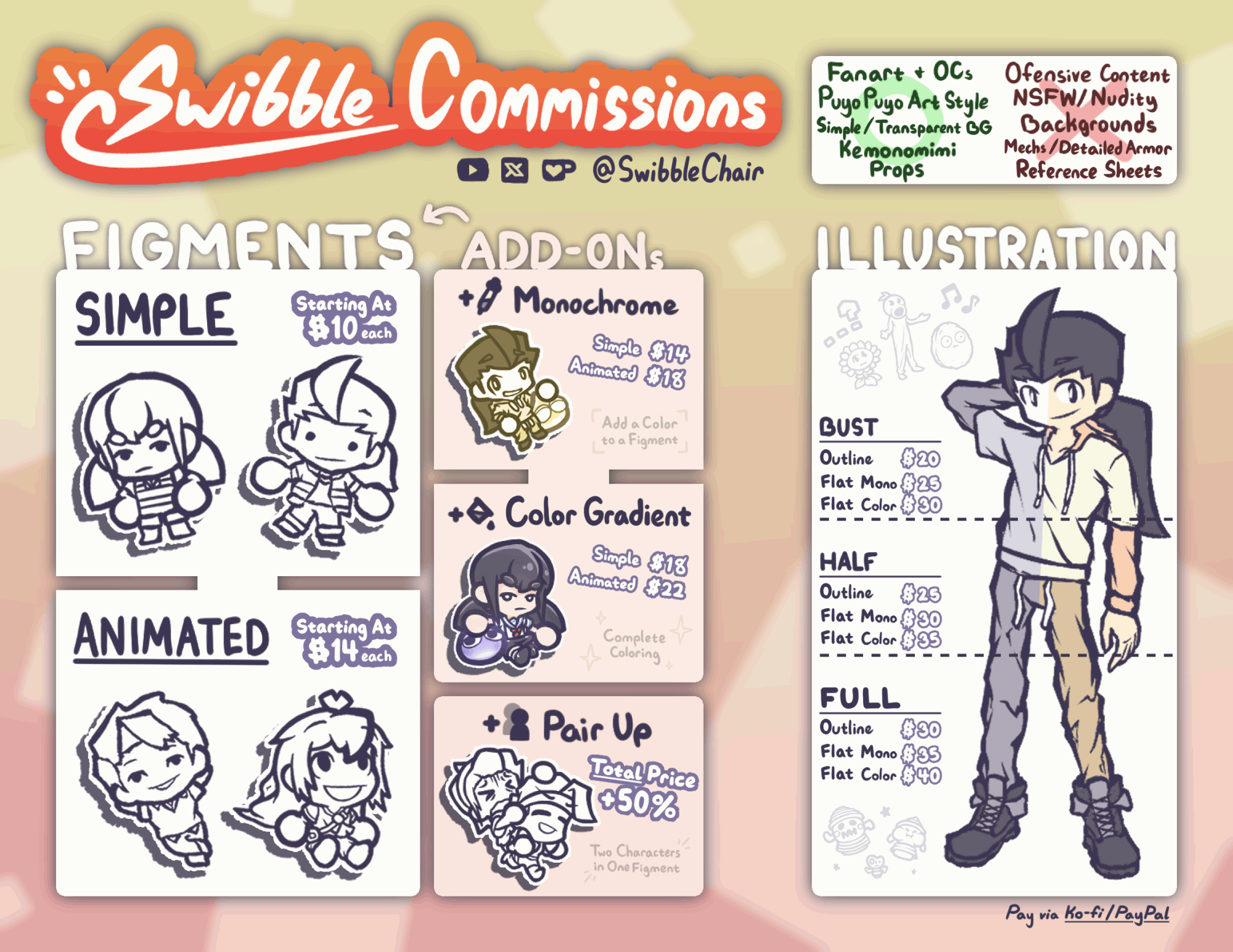 | 3 ) Process & Delivery | Expected Step-by-Step Process Starting a Commission! 1. Please DM me to start your commission! My preference is through X Messaging. ➤ https://twitter.com/SwibbleChair 2. I will make sure you are aware of the Terms of Service I have written down. 3. Please provide me references of the character(s) and/or ideas (if applicable) you want me to draw! Even quick doodles in MS Paint are useful for me to get a visual on what you'd like! 4. Once the order is in agreement, I will begin working on your commission when I can! Working on the Commission 5. Payment 1/2 I will send you a sketch of the commission for your approval. Once approved, I will send you an invoice. Once paid, I will move on to the main illustration. 6. As I finalize the work, I will give you options for the finishing touches such as [Choice of Outline Shadow] and [Choice of Background Color] as it applies to the specifics of the commission in question. (It'll make sense when we get there. But if you're unsure, just ask and I can explain it!) Delivery 7. Payment 2/2 Once the finishing touches are done, I will ask you to finish the invoice payment. 8. Once done, the finished artwork will be delivered to your email as well as recorded on my Google Drive which I will also share the link with you. 9. Enjoy your artwork! • The commission may take sometime between a couple days to a week to even a month depending on complexity! |